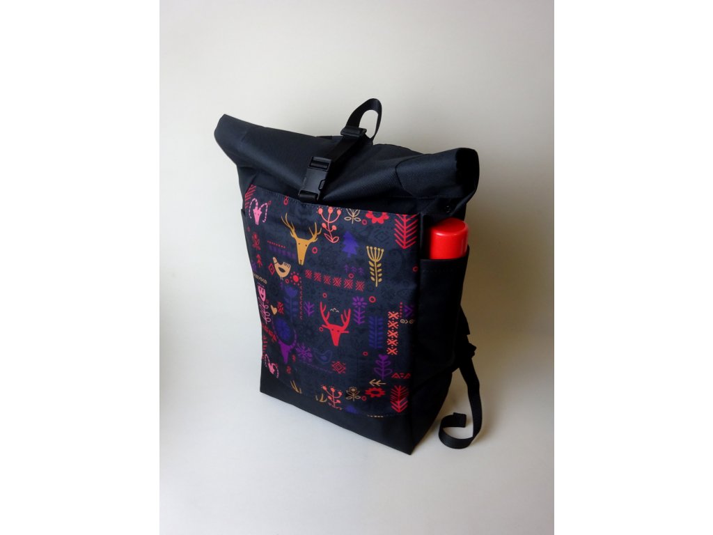 - batoh je vyroben z polyesterové designové voděodolné a pevné vzorované tkaniny (s gramáží cca 220g/m2) - na přední kapse - motiv FOLK DEER - přední kapsa bude mít skrytý zip (zakrytý cca 6 cm légou)
