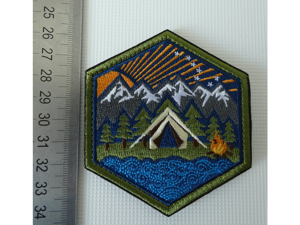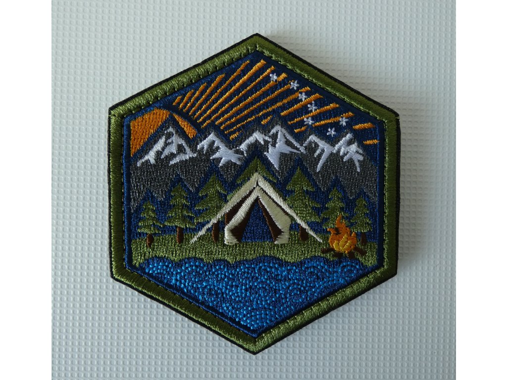 Kvalitně vypracovaná nášivka s motivem hor, jezera, ohně, stanu, lesa VE DNE.