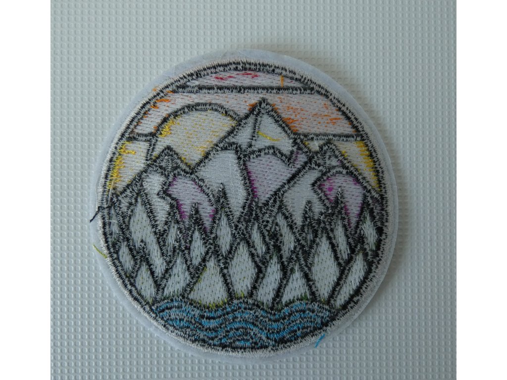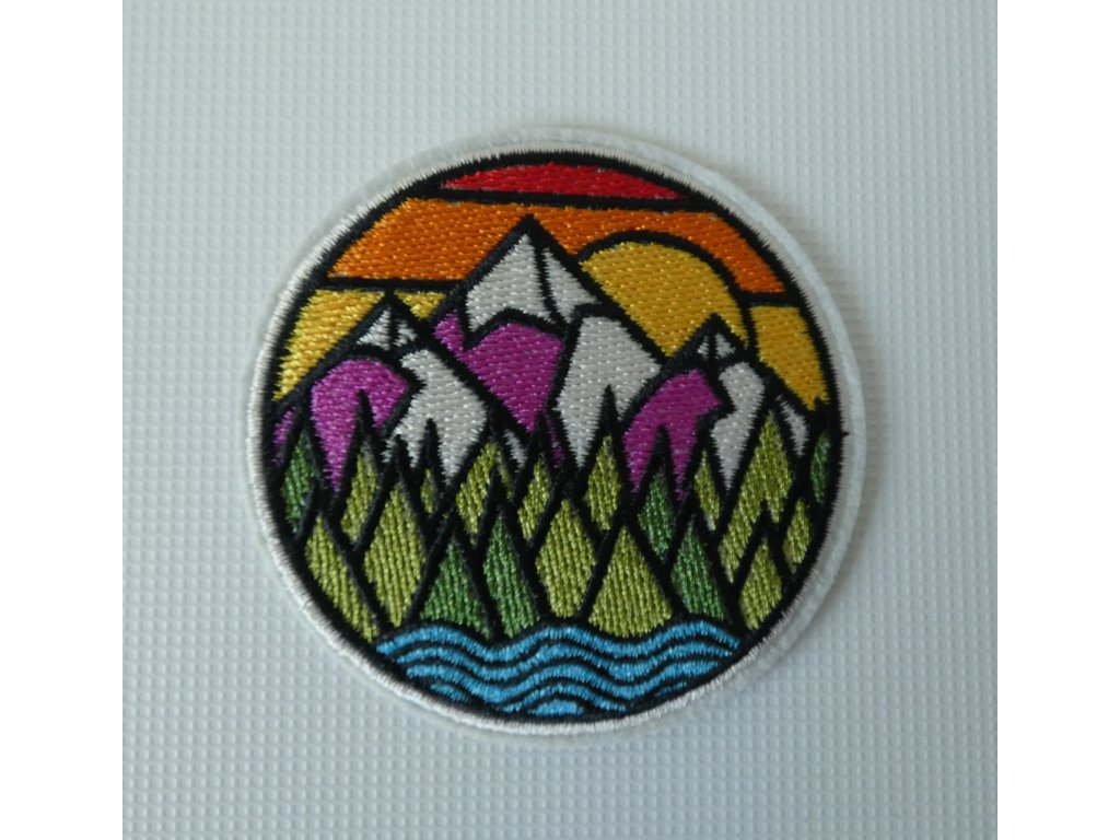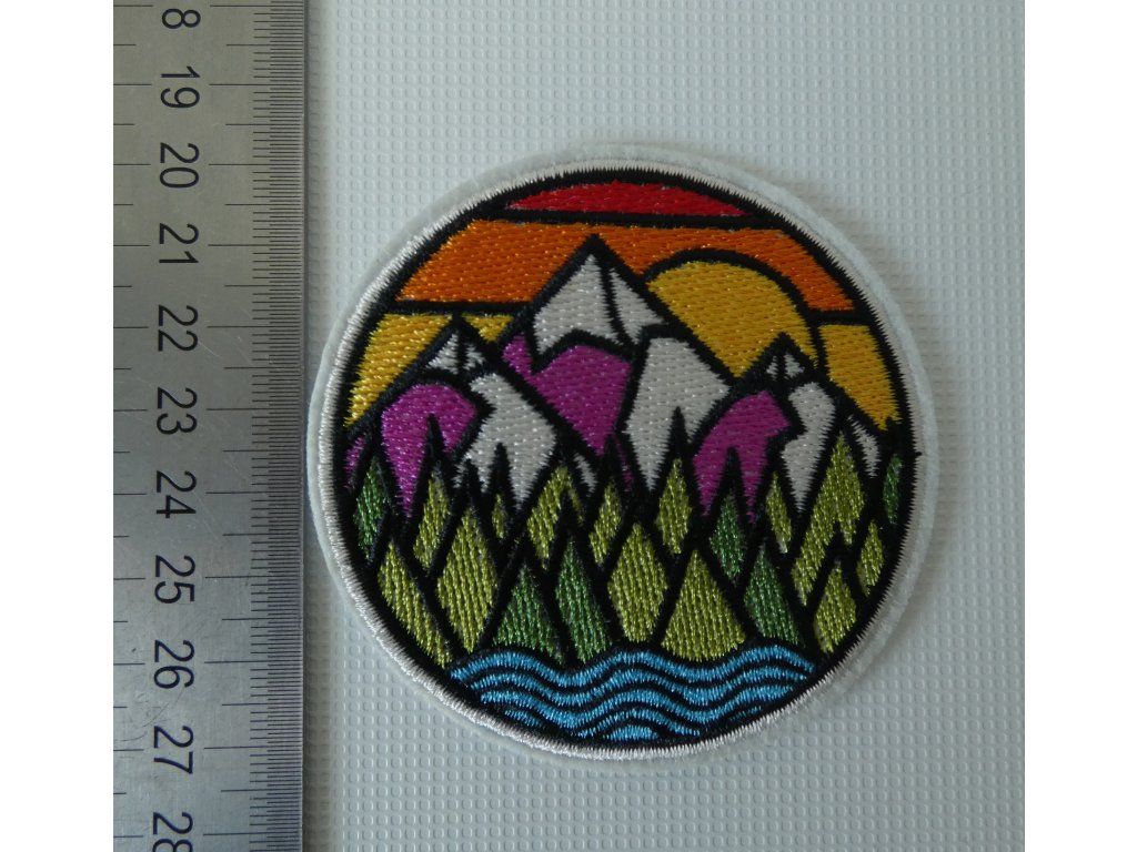 Kvalitně vypracovaná nažehlovací nášivka s motivem slunce, hor, lesa a vody.