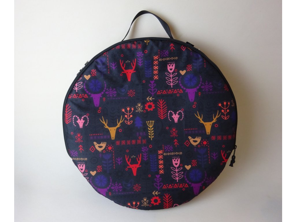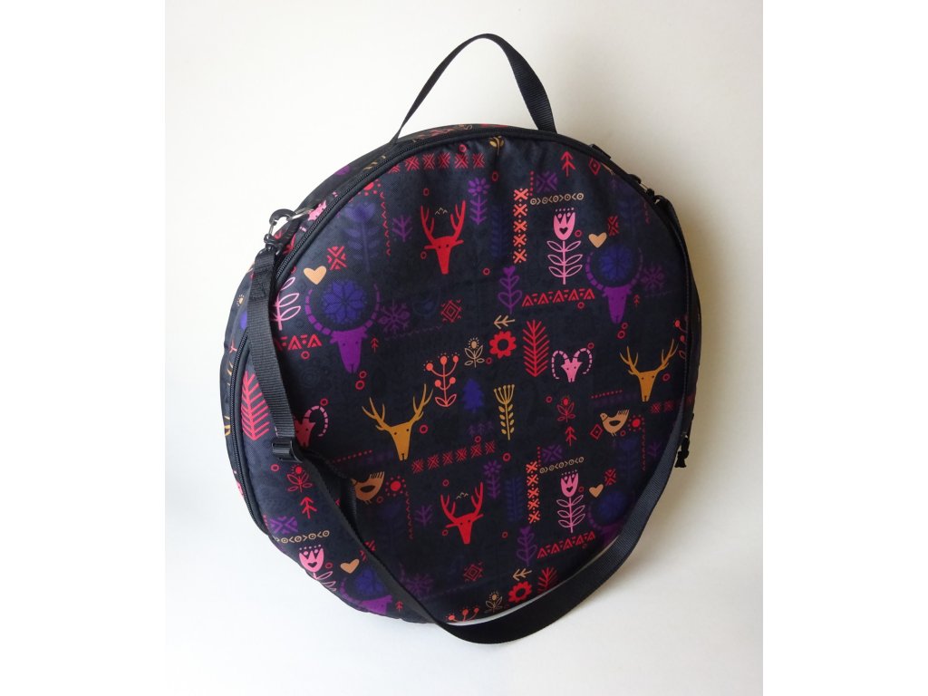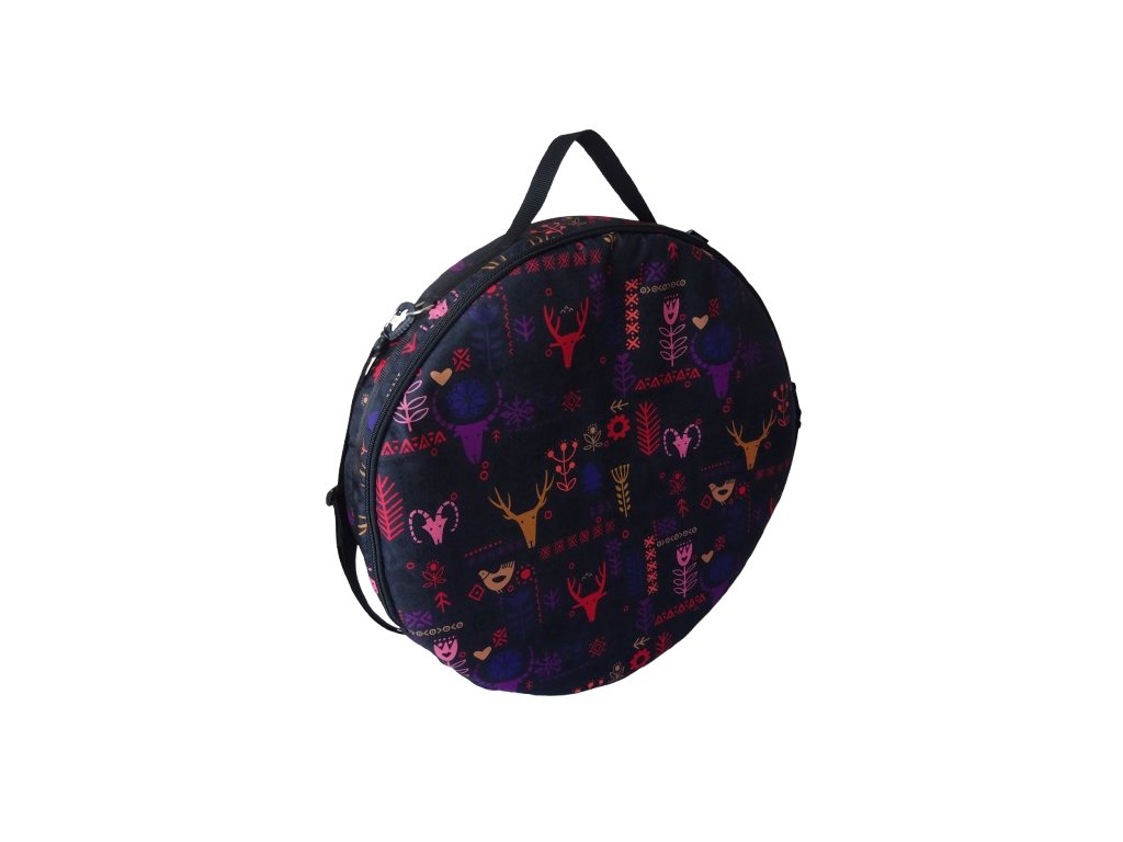 Nabízím vám tímto obal na šamanský buben - originálního střihu a detailního provedení - z mé dílny. Obal je vhodný pro bubny o maximální velikost 50 x 8 cm. Obal má velikostní rezervu. Čili pokud vašemu bubnu vystupuje zadní výplet, či je-li mírně nepravidelný, lze obal také použít - nicméně je potřeba počítat s tím, že může být při větší velikosti buben v obalu trochu na těsno.