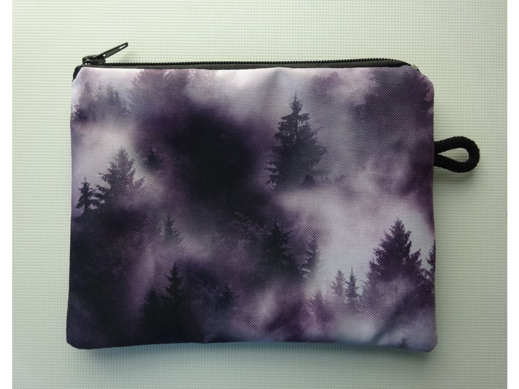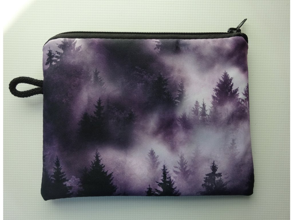 voděodolná a pevná kapsička s motivem mlžného lesa ve fialových tónech